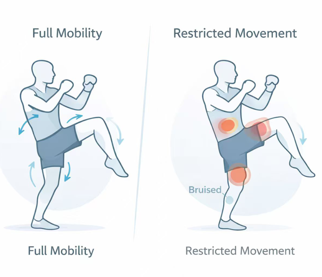 A fresh bruise is tender to the touch. That tenderness changes how you move. You might pull a punch slightly, hesitate before throwing a kick, or avoid certain drills that put pressure on the sore area. These small compensations add up. Over the course of a training session, you are not training at full capacity. Over a training camp, those limitations can mean the difference between feeling sharp on fight night and feeling sluggish. Bruising also affects the muscles underneath the skin. When blood pools in the tissues, it creates pressure and stiffness, reducing range of motion and slowing down reaction time. For a fighter who relies on explosive movement and split-second reactions, even a small loss of speed or mobility matters.