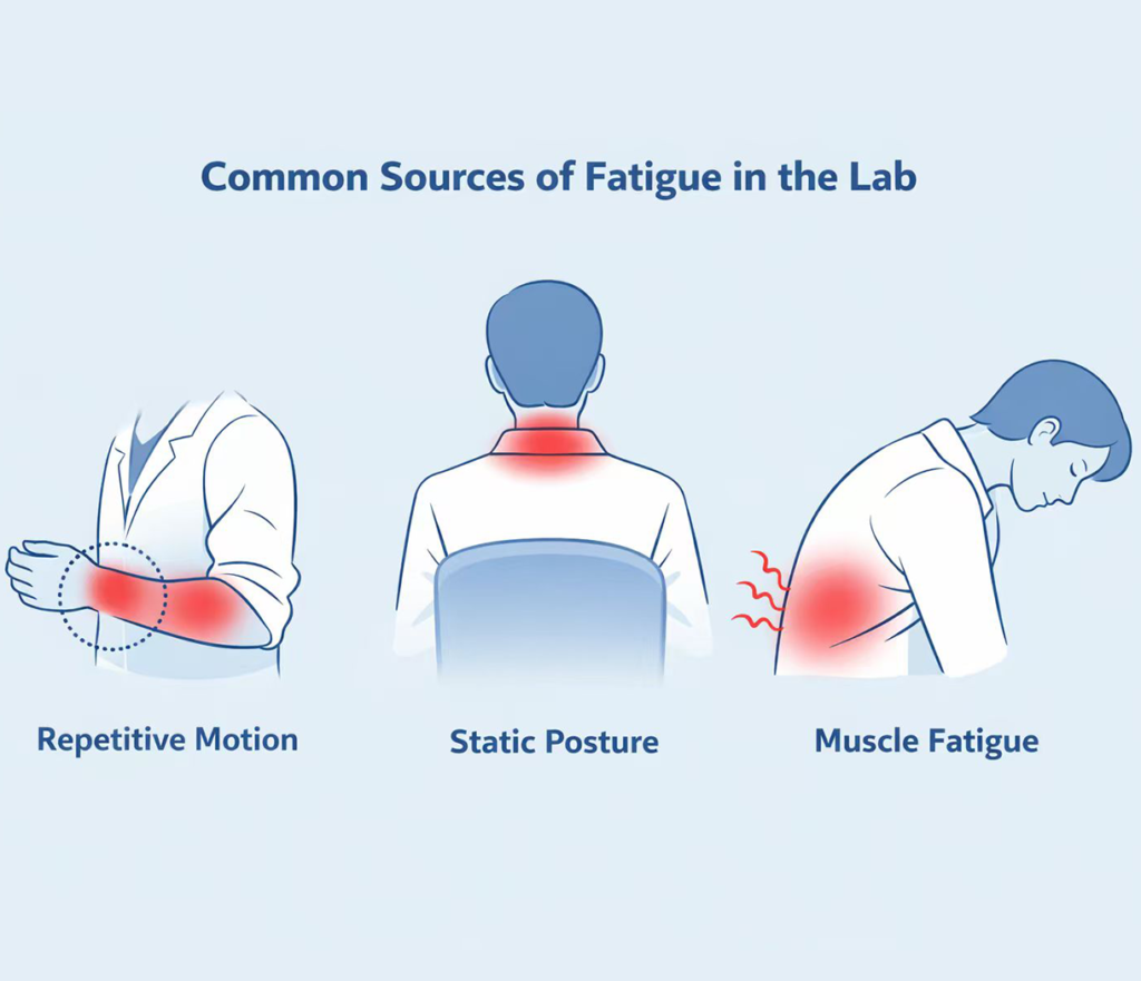 Laboratory personnel also face mental and postural challenges. Maintaining high levels of concentration during delicate procedures can create tension in the trapezius, cervical, and upper back muscles. Additionally, sitting or standing in a fixed posture for hours restricts blood flow, reducing nutrient delivery and slowing metabolic waste clearance from muscle tissues. This combination of cognitive and postural stress intensifies overall fatigue, affecting both physical performance and mental focus.