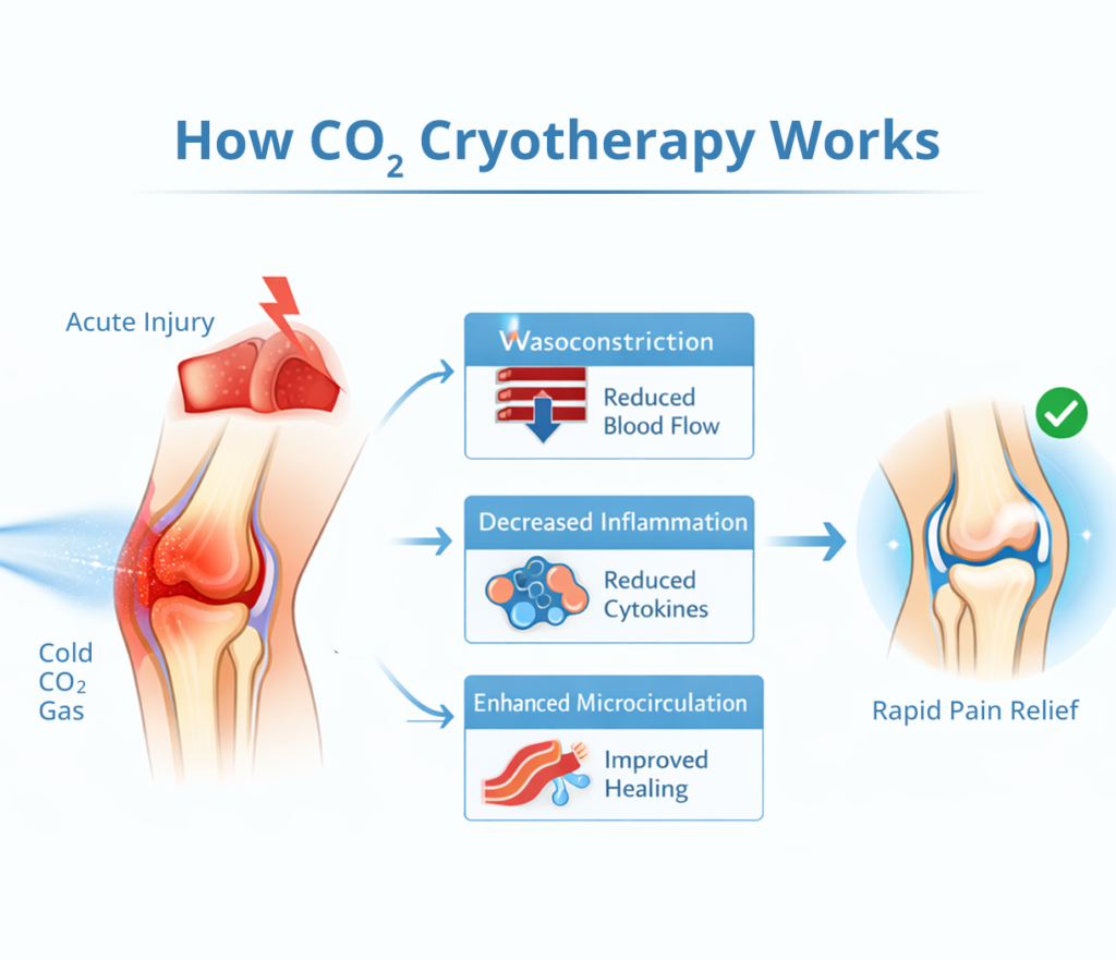 Acute injuries such as sprains, strains, and soft tissue trauma are common in sports, workplaces, and daily activities. Rapid pain relief and inflammation control are essential to prevent further tissue damage and to accelerate recovery. Traditional first aid methods, such as ice packs, compression, and elevation, are effective to some extent but often provide limited precision and speed. CO₂ Cryotherapy, a form of localized cold therapy using carbon dioxide gas, has emerged as a non-invasive, rapid, and highly targeted alternative. By leveraging vasoconstriction, reduced inflammatory mediator activity, and enhanced microcirculation, CO₂ Cryotherapy offers immediate symptom relief. This article explores its mechanisms, clinical applications, safety considerations, and integration with conventional first aid for acute injury management.