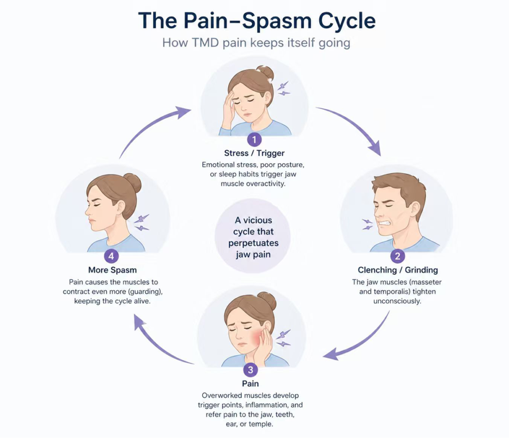 The pain‑spasm cycle begins when a muscle is overworked. The fatigue triggers the release of inflammatory mediators that sensitize nerve endings. In response, the muscle contracts even more to “protect” the area, a reflex called guarding. This extra contraction reduces blood flow, causing more ischemia, which then produces more pain. The jaw is especially vulnerable because we use it constantly. Even when you try to relax, the masseter and temporalis may stay partially contracted from habit or stress. Once the cycle establishes itself, the pain becomes self‑sustaining. Treating only the joint or only the teeth often fails because the muscle tension remains.