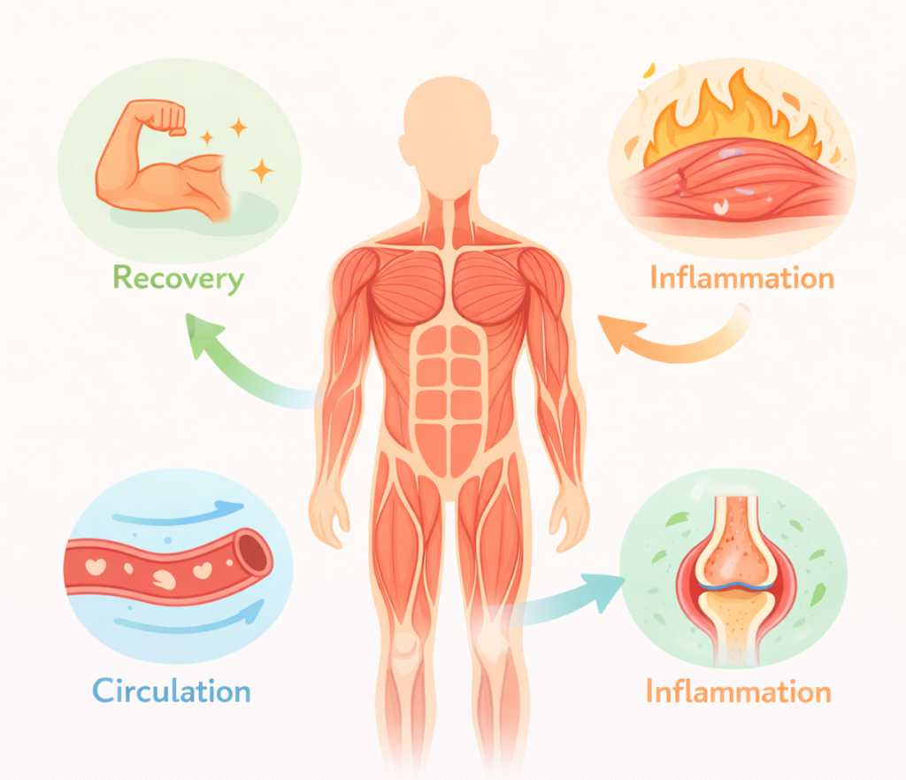 Proper recovery allows the body to repair damaged muscle fibers and restore physiological balance. Without adequate recovery, repeated physical stress can lead to prolonged inflammation and decreased performance. Therefore, recovery strategies play an important role in maintaining both training effectiveness and long-term muscular health.